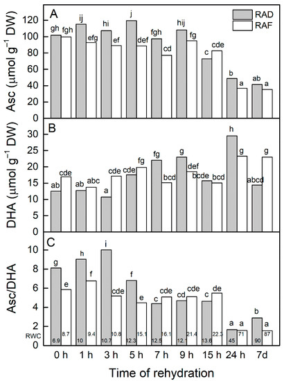 Changes in ascorbate (Asc, A) and dehydroascorbate contents (DHA, B) and the Asc/DHA ratio (C) during the recovery of Haberlea rhodopensis from drought- and freezing-induced desiccation. The measurements were performed on air-dried plants (0 h) and after 1, 3, 5, 7, 9, 15, and 24 h as well as 7 days of rehydration after drought- (RAD) and freezing-induced desiccation (RAF). The RWCs of the plants at each time point, presented in %, are shown at the bottom of the columns. Data represent the mean ± SE of n = 9. The same letters within a graph indicate no significant differences assessed by the Fisher LSD test (p ≤ 0.05) after performing ANOVA.