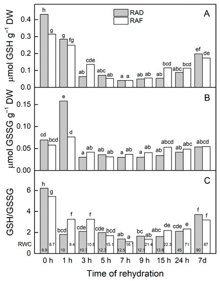 The content of GSH was similarly affected during the rehydration of the RAD and RAF plants (r = 0.946). The results presented in Figure 2A show that the content of GSH was kept relatively high 1 h after the rehydration of the plants and then strongly decreased. Similar changes were observed in the content of GSSG (Figure 2B). The enhancement of GSSG after 1 h of rehydration, especially in the RAD plants, was followed by a significant reduction in its amount in the course of the rehydration (p ≤ 0.05; Figure 2B). Rehydration led to a strong decline in the GSH/GSSG ratio even at the first hours of rehydration, and it was stronger in the RAD plants (Figure 2C). This ratio reached minimum values after 7 h of rehydration, after which there was a tendency for its increase, and after 7 d of rehydration, the values were significantly higher compared with those after 24 h in both plant groups (p ≤ 0.05). In fact, a similar tendency was detected for the changes in GSH and GSSG.