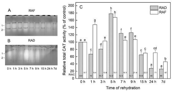 Isoenzyme patterns (A,B) and relative total activity (C) of catalase (CAT) during the recovery of Haberlea rhodopensis from drought- and freezing-induced desiccation. The CAT isoenzymes are numbered from cathode to anode. The total activity for a particular treatment is expressed as percentage of control. The analyses were performed with air-dried plants (0 h) and after 1, 3, 5, 7, 9, 15, and 24 h as well as 7 days of rehydration after drought- (RAD) and freezing-induced desiccation (RAF). The RWCs of the plants at each time point, presented in %, are shown at the bottom of the columns. Data represent the mean ± SE n = 3. The same letters within a graph indicate no significant differences assessed by the Fisher LSD test (p ≤ 0.05) after performing ANOVA.