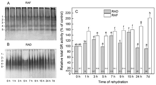 Isoenzyme patterns (A,B) and relative total activity (C) of glutathione reductase (GR) during the recovery of Haberlea rhodopensis from drought- and freezing-induced desiccation. The GR isoenzymes are numbered from cathode to anode. The total activity for a particular treatment is expressed as percentage of control. The analyses were performed with air-dried plants (0 h) and after 1, 3, 5, 7, 9, 15, and 24 h as well as 7 days of rehydration after drought- (RAD) and freezing-induced desiccation (RAF). The RWCs of the plants at each time point, presented in %, are shown at the bottom of the columns. Data represent the mean of ± SE n = 3. The same letters within a graph indicate no significant differences assessed by the Fisher LSD test (p ≤ 0.05) after performing ANOVA.