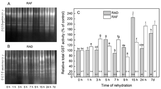 Isoenzyme patterns (A,B) and relative total activity (C) of glutathione S-transferase (GST) during the recovery of Haberlea rhodopensis from drought- and freezing-induced desiccation. The GST isoenzymes are numbered from cathode to anode. The total activity for a particular treatment is expressed as percentage of control. The analyses were performed with air-dried plants (0 h) and after 1, 3, 5, 7, 9, 15, and 24 h as well as 7 days of rehydration after drought- (RAD) and freezing-induced desiccation (RAF). The RWCs of the plants at each time point, presented in %, are shown at the bottom of the columns. Data represent the mean ± SE of n = 3. The same letters within a graph indicate no significant differences assessed by the Fisher LSD test (p ≤ 0.05) after performing ANOVA.