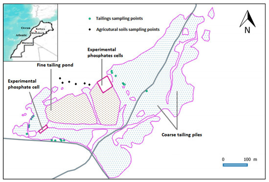 The abandoned Kettara pyrrhotite mine, located 30 km northwest of Marrakech (Morocco), is a district rich in metals [18,19]. The pollution problem of this mine site is mainly due to the phenomenon of acid mine drainage (AMD). AMD is produced by sulfurous minerals present in the ore, pyrite and pyrrhotite, exposed to water and the atmospheric air. This acidity, combined with the presence of metals and metalloids, can seriously affect the ecosystems that receive the contaminated effluents. In order to reduce AMD from this mine site, previous work resulted in the construction of a hydrogeological (store-and-release) cover system based on phosphate waste for reducing water infiltration, in order to rehabilitate this former mining site. To finalize the rehabilitation plan, a vegetation study must be carried out, on the one hand, to develop an effective and inexpensive way of stabilizing the cover and, on the other, to ensure its durability and therefore the reintegration of the soil [20,21,22,23,24,25].