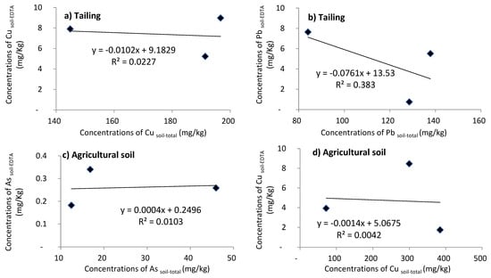 Correlation between total (a) Cu and (b) Pb content and its bioavailable fractions in tailings, and the correlation between total (c) As and (d) Cu content and its bioavailable fractions in agricultural soil.