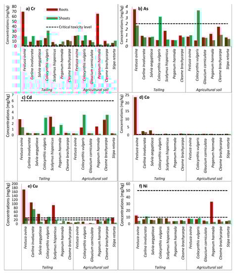 The metals Co, Cr and Pb showed a high concentration and exceeded the level of toxicity [34] in the shoots and roots of all plants in the two study areas (Figure 3).