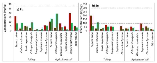 Concentration of (a) Cr, (b) As, (c) Cd, (d) Co, (e) Cu, (f) Ni, (g) Pb, and (h) Zn in shoots and roots (mg/kg dry weight) of species growing in tailings and in agricultural soil at Kettara abandoned mine.