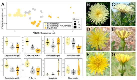 (A) PCA and violin plots showing morphological trait distribution in Urospermum dalechampii (yellow), U. dalechampii × U. picroides (grey) and U. picroides (orange). PCA of log-transformed capitula measurements was performed on a dataset including capitulum height, capitulum width, involucre height, involucre width and receptacle width. Horizontal lines of violin plots represent mean values for the variables, and dots represent values for each individual. Letters above violins indicate which groups are statistically different from one another. (B–G) Capitula’s frontal and lateral views of U. dalechampii (B,C), U. dalechampii × U. picroides (D,E), and U. picroides (F,G).