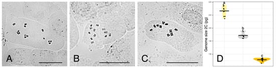 (A–C) Somatic metaphase plates of Urospermum dalechampii, 2n = 14 (A), U. dalechampii × U. picroides, 2n = 12 (B), and U. picroides, 2n = 10 (C). Scale bars = 10 μm. (D) Violin plots showing the distribution of genome size in U. dalechampii (yellow), U. dalechampii × U. picroides (grey) and U. picroides (orange). Horizontal lines of violin plots represent mean values for the variables, and dots represent values for each individual. Letters above violins indicate which groups are statistically different from one another.