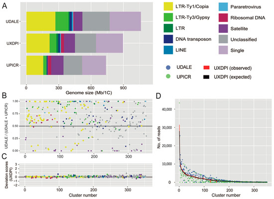 (A) Genomic composition of Urospermum dalechampii (UDALE), U. dalechampii × U. picroides (UXDPI) and U. picroides (UPICR). Estimates of the genomic abundances (in Mb/1C) of different repeats are colored by repeat class. The size of the unclassified (grey) and low/single copy fraction (pale purple) of each genome is also shown. (B) Comparison of cluster abundances in the parental species U. dalechampii and U. picroides, irrespective of cluster size. Read clusters falling along the black line (i.e., value of 0.5) have the same proportion in both species. Those above the 0.5 are more abundant in U. dalechampii and those below this threshold are more abundant in U. picroides. (C) Deviation scores of observed cluster sizes from the expected values in the putative hybrid (UXDPI). Clusters above and below 0 line represent larger and/or smaller values than the expected values from parents. (D) Scatter plot of genomic contributions (read clusters) of U. dalechampii (blue dots) and U. picroides (green dots) to the hybrid U. dalechampii × U. picroides (red line) and the expected values calculated assuming a 50% genome dosage (black line).