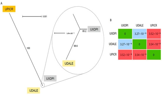 (A) Neighbor-Net splits graph based on uncorrected p-distances of the chloroplast matrix of U. dalechampii (UDALE), U. picroides (UPICR) and U. dalechampii × U. picroides (UXDPI). Numbers in branches indicate bootstrap support. (B) Distance matrix of the three taxa included in the analysis.