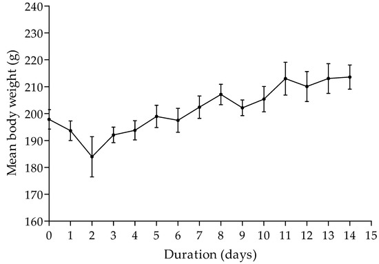 Animals were observed daily for 14 days post-dosing and the weight of each animal was measured. The first 3–4 h after administration of the extract was considered most important for acute toxicity studies [25]. After 2 h of herbal administration, the percentage in loss in body weight of animals was, on average, 2.07%, while the percentage loss in body weight after 3 h was 3.17 %, on average. However, only one rat showed vocalization when handled within the first 2 h after herbal administration. After 3 h of herbal administration, the weight of the rats decreased further by an average of 3% and all rats showed vocalization when handled. The average weight decreased from 193.61 g to 183.94 g within the first two days after extract administration. The percentage loss in body weight over the first two days after herbal extract administration was less than the 10% threshold. There was a general increase in average body weight over the next 12 days of the 14-day period (Figure 1).