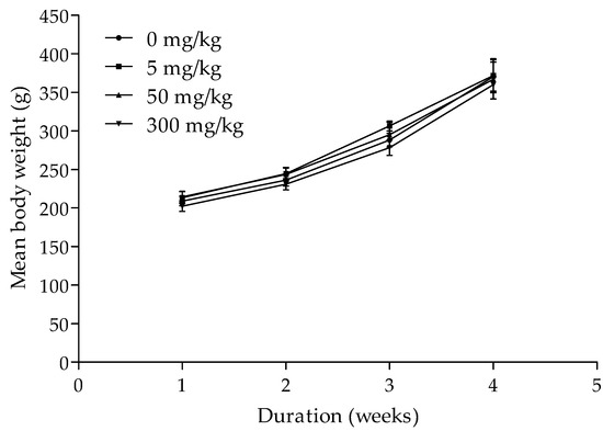 Mean body weight (g) of rats treated with varying doses of aqueous herbal extract weekly over a four-week duration. Values are mean (standard error, n = 7).