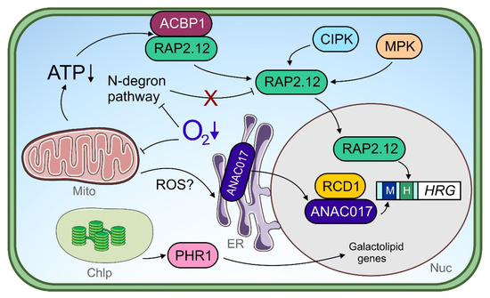 While mitochondrial retrograde signaling is becoming more and more the subject of interest under low O2 stress, retrograde signaling events derived from the chloroplast are much less explored. Notably, ANAC017 and its repressor RCD1 together establish a communication link between the chloroplast and the mitochondrion (Figure 2) [186,190], which strengthens the already suggested role of ANAC017 in chloroplast function coordination [157]. The loss of RCD1 increases the expression of mitochondrial dysfunction stimulon (MDS) genes typically regulated by ANAC017 [186,191]. It would be worthwhile to test whether the ANAC017-RCD1 module also participates in plastid-to-mitochondrion communication pathways during low O2 stress. Under hypoxia, the rcd1 mutant shows an impressive tolerance towards methyl viologen (MV), which leads to ROS formation in the chloroplast in the light [190]. This enhanced phenotype is interestingly not the consequence of altered plastidial ROS scavenging abilities, but can be traced back to a disrupted electron transfer from photosystem I (PSI) to MV found in the wildtype. Likewise, a correlation between improved MV tolerance under aerobic conditions and enhanced MDS expression is observed for ANAC017 overexpression plants [191]. It is worth mentioning in the context of illuminated hypoxia-specific chloroplast signaling the MYB factor phosphate starvation 1 (PHR1), which mediates both transcriptional responses to O2 deficiency and phosphate starvation, and is potentially post-translationally activated by a retrograde signal upon lowered photosynthesis (Figure 2). Interestingly, PHR1, which mainly regulates galactolipid-related genes (present in chloroplast membranes) but not anaerobic core genes, acts completely independently of ERF-VII factors or the N-degron pathway under hypoxia [161].