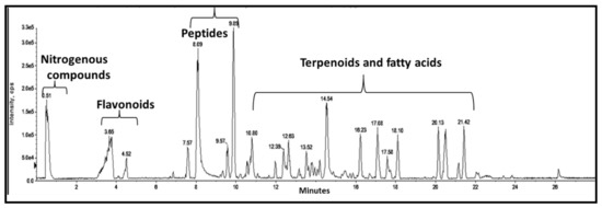 A total of 133 compounds were annotated in the extract representing different primary and secondary metabolites. Flavonoids and amino acids were eluted between 0–6 min, cyclic peptides were eluted from 9–11 min while diterpenoids, sterols, fatty acids, and fatty acid glycerides were eluted at the late part of the chromatographic run, Figure 5.