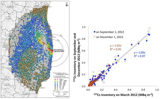 - Mikami, S.; Maeyama, T.; Hoshide, Y.; Sakamoto, R.; Sato, S.; Okuda, N.; Demongeot, S.; Gurriaran, R.; Uwamino, Y.; Kato, H.; et al. Spatial distributions of radionuclides deposited onto ground soil around the Fukushima Dai-ichi Nuclear Power Plant and their temporal change until December 2012. J. Environ. Radioact. 2015, 139, 320–343. [Google Scholar] [CrossRef] [PubMed]