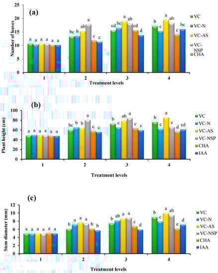 Comparison of average soil application of experimental treatments on number of leaves (a), plant height (b) and stem diameter (c) at treatment levels (levels 1, 2, 3 and 4 for VC, VC-N, VC-AS and VC-NSP treatments of 0, 1, 2 and 3% VC, 0, 200, 400 and 600 mg of CHA per kg of soil and 0, 10−6, 10−5 and 10−4 molar IAA). Different letters in each figure show significant difference at p ≤ 0.05 by Duncan multiple range test. VC, VC without enrichment; VC-N, VC enriched with 1% nitrogen; VC-NSP, VC enriched with 1% nitrogen, 1% sulfur, and 1% phosphorus; VC-AS, VC enriched with Azotobacter chroococcum (21Az) + Pseudomonas fluorescens (Ps 59); CHA, Commercial humic acid; IAA, Indole-3-acetic acid.