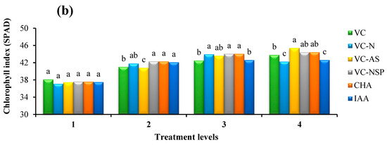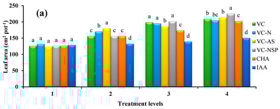 Comparison of average soil application of experimental treatments on leaf area (a) and chlorophyll index (SPAD) (b) at treatment levels (levels 1, 2, 3 and 4 for VC, VC-N, VC-AS and VC-NSP treatments of 0, 1, 2 and 3% VC, 0, 200, 400 and 600 mg of CHA per kg of soil and 0, 10−6, 10−5 and 10−4 molar IAA). Different letters in each figure show significant difference at p ≤ 0.05 by Duncan multiple range test. VC, VC without enrichment; VC-N, VC enriched with 1% nitrogen; VC-NSP, VC enriched with 1% nitrogen, 1% sulfur, and 1% phosphorus; VC-AS, VC enriched with Azotobacter chroococcum (21Az) + Pseudomonas fluorescens (Ps 59); CHA, Commercial humic acid; IAA, Indole-3-acetic acid.