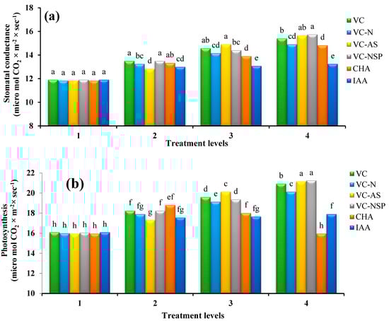 Comparison of average soil application of experimental treatments on stomatal conductance (a) and photosynthesis (b) at treatment levels (levels 1, 2, 3 and 4 for VC, VC-N, VC-AS and VC-NSP treatments of 0, 1, 2 and 3% VC, 0, 200, 400 and 600 mg of CHA per kg of soil and 0, 10−6, 10−5 and 10−4 molar IAA). Different letters in each figure show significant difference at p ≤ 0.05 by Duncan multiple range test. VC, VC without enrichment; VC-N, VC enriched with 1% nitrogen; VC-NSP, VC enriched with 1% nitrogen, 1% sulfur, and 1% phosphorus; VC-AS, VC enriched with Azotobacter chroococcum (21Az) + Pseudomonas fluorescens (Ps 59); CHA, Commercial humic acid; IAA, Indole-3-acetic acid.