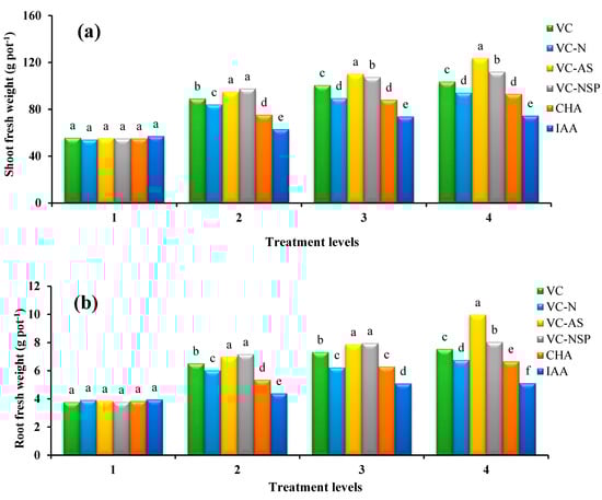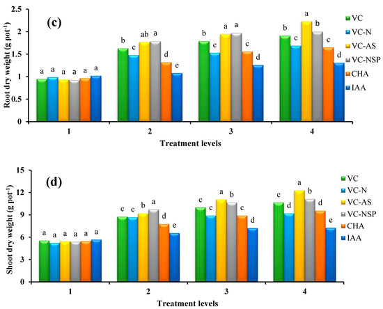Comparison of average soil application of experimental treatments on shoot fresh weight (a), Root fresh weight (b), root dry weight (c) and shoot dry weight (d) at treatment levels (levels 1, 2, 3 and 4 for VC, VC-N, VC-AS and VC-NSP treatments of 0, 1, 2 and 3% VC, 0, 200, 400 and 600 mg of CHA per kg of soil and 0, 10−6, 10−5 and 10−4 molar IAA). Different letters in each figure show significant difference at p ≤ 0.05 by Duncan multiple range test. VC, VC without enrichment; VC-N, VC enriched with 1% nitrogen; VC-NSP, VC enriched with 1% nitrogen, 1% sulfur, and 1% phosphorus; VC-AS, VC enriched with Azotobacter chroococcum (21Az) + Pseudomonas fluorescens (Ps 59); CHA, Commercial humic acid; IAA, Indole-3-acetic acid.