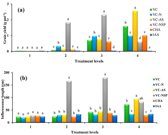 Comparison of average soil application of experimental treatments on Grain yield (a) and Inflorescence length (b) at treatment levels (levels 1, 2, 3 and 4 for VC, VC-N, VC-AS and VC-NSP treatments of 0, 1, 2 and 3% VC, 0, 200, 400 and 600 mg of CHA per kg of soil and 0, 10−6, 10−5 and 10−4 molar IAA). Different letters in each figure show significant difference at p ≤ 0.05 by Duncan multiple range test. VC, VC without enrichment; VC-N, VC enriched with 1% nitrogen; VC-NSP, VC enriched with 1% nitrogen, 1% sulfur, and 1% phosphorus; VC-AS, VC enriched with Azotobacter chroococcum (21Az) + Pseudomonas fluorescens (Ps 59); CHA, Commercial humic acid; IAA, Indole-3-acetic acid.