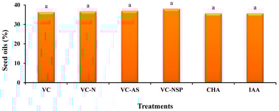 Comparison of average soil application of experimental treatments on seed oils at different treatments. Different letters in each figure show significant difference at p ≤ 0.05 by Duncan multiple range test. VC, VC without enrichment; VC-N, VC enriched with 1% nitrogen; VC-NSP, VC enriched with 1% nitrogen, 1% sulfur, and 1% phosphorus; VC-AS, VC enriched with Azotobacter chroococcum (21Az) + Pseudomonas fluorescens (Ps 59); CHA, Commercial humic acid; IAA, Indole-3-acetic acid.