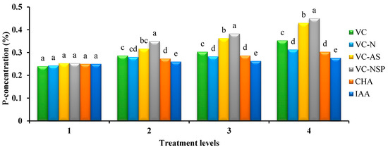 Comparison of average soil application of experimental treatments on P-concentration at treatment levels (levels 1, 2, 3 and 4 for VC, VC-N, VC-AS and VC-NSP treatments of 0, 1, 2 and 3% VC, 0, 200, 400 and 600 mg of CHA per kg of soil and 0, 10−6, 10−5 and 10−4 molar IAA). Different letters in each figure show significant difference at p ≤ 0.05 by Duncan multiple range test. VC, VC without enrichment; VC-N, VC enriched with 1% nitrogen; VC-NSP, VC enriched with 1% nitrogen, 1% sulfur, and 1% phosphorus; VC-AS, VC enriched with Azotobacter chroococcum (21Az) + Pseudomonas fluorescens (Ps 59); CHA, Commercial humic acid; IAA, Indole-3-acetic acid.
