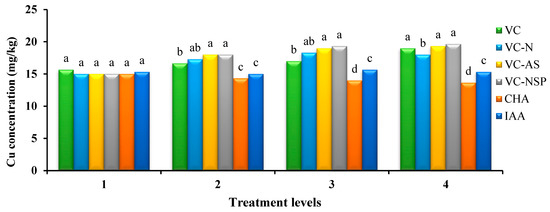 The results of variance analysis on copper showed a significant difference between the various levels of treatments. The highest and lowest amounts of copper were observed under VC and the CHA treatments (Figure 8). Increasing the concentration and consumption percentage of treatments increased the amounts of copper in treatments. It is reported that HA creates low-soluble complexes with copper, which leads to reduced uptake by plants [81]. Therefore, its content was monitored in canola shoot. Given the measurement of the total copper contents of the plant, the reason for the increased amounts of copper in VC treatments can be attributed to the high extents of growth and dry weights if these treatments. Moreover, the addition of VC bio-fertilizers would enhance access to and absorption of trace elements such as copper by increasing the organic materials of the soil and subsequently, increasing cation exchange capacity [82].