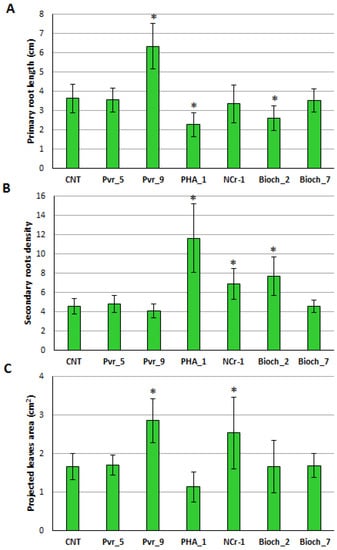 The density of the seedlings secondary roots treated with bacteria was also evaluated: in PHA_1-inoculated plantlets the value was about three times significantly higher (p < 0.05) than in the control condition, and a significant increase (p < 0.05) was also observed for NCr-1 and Bioch_2-treated seedlings. No significant differences were detected in the case of the application of the other strains (Figure 1B).