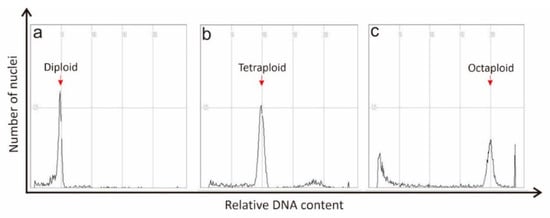 Flow cytometry may also be the unique method incorporating strong analytical utility to calculate the cell nucleus’s physical size and genome [95,96]. Flow cytometry is a comparatively simple and easy method of calculating a polyploid’s nuclear DNA material. By measuring the relative DNA content using flow cytometry [97,98], the ploidy level of mediated polyploids can be easily verified (Figure 2). However, flow cytometry has some limitations as it is not precise enough to estimate the exact chromosomes number and is unable to differentiate the variation in chromosomes number compared to the ploidy level.
