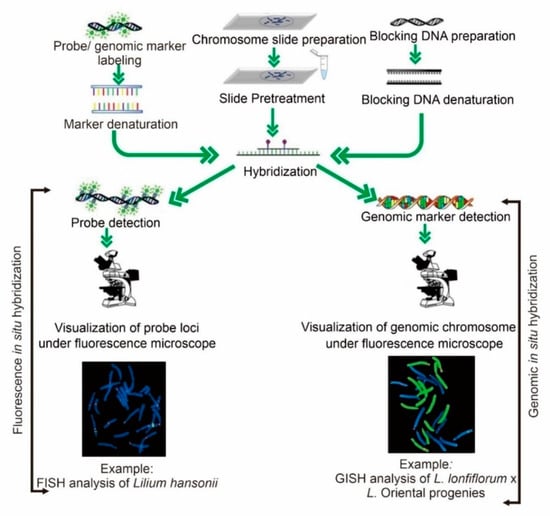 Molecular cytogenetic research approaches such as FISH and GISH are commonly used and well-respected tools to investigate plant genetics. FISH and GISH have often been used to identify information surrounding chromosomal mutations, structure, and genomic evolution [99,100]. Oligos specific to a repetitive sequence or a particular genomic region can be visualized using fluorescence in situ hybridization [8,101,102,103]. For example, different ribosomal DNA (rDNA) signals are doubled in a tetraploid compared to those in a diploid. A study of 5S rDNA in cotton plants revealed that most diploids have two 5S rDNA signals and all allotetraploid species have four 5S rDNA signals [104]. The same result was found in a woody species of the genus Rubus [105]. The 45S, 18S, 25S, and 5S rDNA are commonly used as FISH markers for cytogenetic study. This method has been used intensely in gene duplication methods and amplification in intraspecific and interspecific polyploids. A brief working directory of FISH and GISH is shown in Figure 3.