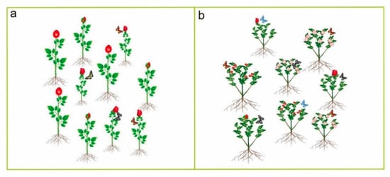 On the other hand, Nuismer and Thompson [183] recorded frequent attacks by a stem borer moth Greya piperella in Heuchera grossulariifolia diploids rather than in tetraploids. Likewise, diploid Gymnadenia conopsea orchids [184] were more frequently attacked by aphids than their corresponding tetraploids. These contrasting findings indicate that polyploidy does not inhibit the behavior of herbivores. However, it has been suggested that insect herbivory is not a cytotype-dependent habitat selection but plays a key role in host-seeking. In open fields and natural ecosystems, insects typically prefer the most common host in that habitat. Alternatively, in a typical garden (Figure 6) where all cytotypes are grown, insects forage the hosts equally [185]. Although the results show that polyploidy has various implications concerning insect attacks, it can provide some trade-offs. Generally, polyploids produce higher growth and reproductive ability. Therefore, polyploids can help avoid economic injury and an herbivory-induced economic threshold, which can be difficult in diploids.