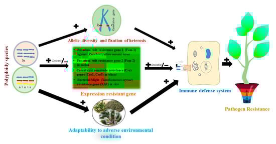 Several studies have reported that pathogen resistance in the polyploid genotype is higher than its diploid generation [187,188]). Autotetraploid and autotriploid watermelon demonstrated higher fusarium resistance than diploid watermelon [187]. Diploid apple cultivars are more susceptible to Alternaria alternata, and Colletotrichum gloeosporioides than autotetraploid apple cultivars Hanfu and Gala [188]. Allopolyploid tobacco prevents plant viruses better than diploid tobacco [189]. Tetraploid wheat avoids more powdery mildew and leaf rust than diploid wheat [190,191]. Allelic diversity, gene expression (over), and physiological state are the key factors determining a host plant’s ability to withstand various pathogens.