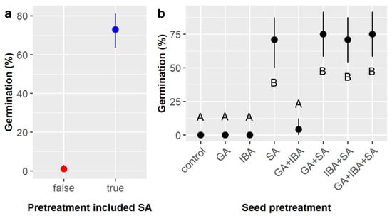 Average germination likelihood of Ebenopsis ebano seeds with 95% confidence intervals broken down by (a) whether sulfuric acid (SA) scarification was included as part of the seed pretreatment (to show the main effect of SA; red dot = SA not included, blue dot = SA included); and (b) pretreatments imposed on Ebenopsis ebano seeds, which included gibberellic acid (GA), indole-3-butyric acid (IBA), sulfuric acid (SA), and all combinations thereof. Capital letters denote the results of least squares means post-hoc tests; groups within a panel that share a letter were not significantly different.