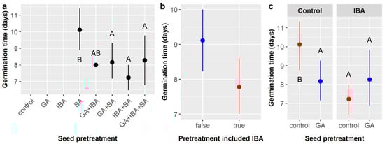 Average time to germination of Ebenopsis ebano seeds with 95% confidence intervals broken down by (a) all pretreatments imposed, which included gibberellic acid (GA), indole-3-butyric acid (IBA), sulfuric acid (SA), and all combinations thereof; (b) whether IBA was included in the seed pretreatment (to show the main effect of IBA; blue dot = IBA not included, red dot = IBA included); and (c) GA and IBA treatments (to show the GA × IBA interactive effect; red dots = GA not included, blue dots = GA included). Capital letters denote the results of least squares means post-hoc tests; groups within a panel that share a letter were not significantly different.