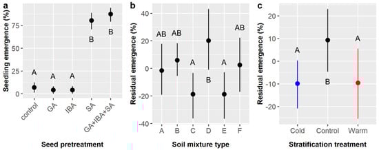 Average likelihoods of Ebenopsis ebano seedling emergence with 95% confidence intervals broken down by (a) chemical seed pretreatment, which included controls, gibberellic acid (GA), indole-3-butyric acid (IBA), sulfuric acid (SA), and GA + IBA + SA; (b) soil mixture type; and (c) stratification treatment (blue dot = cold, black dot = control, red dot = warm). Panels (b,c) show the residual values and their 95% confidence intervals for emergence likelihoods. Capital letters denote the results of least squares means post hoc tests; groups within a panel that share a letter were not significantly different.