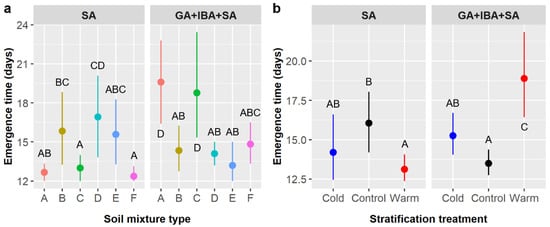 Average time to Ebenopsis ebano seedling emergence with 95% confidence intervals broken down by (a) soil mixture type and the two chemical pretreatments that included SA (dot colors correspond to the six soil mixture types and are included to improve readability); and (b) stratification and pretreatment (blue dots = cold, black dots = control, red dots = warm). Capital letters denote the results of least squares means post-hoc tests; groups within a panel that share a letter were not significantly different. Values shown include observations only from pretreatment groups that included SA.