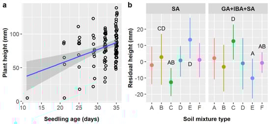 (a) Scatterplot with trendline showing the positive linear relationships between Ebenopsis ebano seedling age and plant height; each dot represents one plant. (b) Average residual plant height with 95% confidence intervals broken down by soil mixture type and the two pretreatments that included SA (dot colors correspond to the six soil mixture types and are included to improve readability). Capital letters denote the results of least squares means post-hoc tests; all groups without labels are in the ‘ABCD’ post-hoc group (labels omitted for clarity); groups within a panel that share a letter were not significantly different. Values shown include observations only from pretreatment groups that included SA.