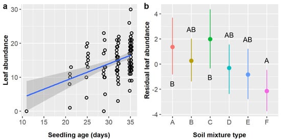 (a) Scatterplot with trendline showing the positive linear relationships between Ebenopsis ebano seedling age and leaf abundance; each dot represents one plant. (b) Average residual leaf abundance with 95% confidence intervals broken down by soil type (dot colors correspond to the six soil mixture types as above to aid comparisons). Capital letters denote the results of least squares means post-hoc tests; groups within a panel that share a letter were not significantly different. Values shown include observations only from pretreatment groups that included SA.