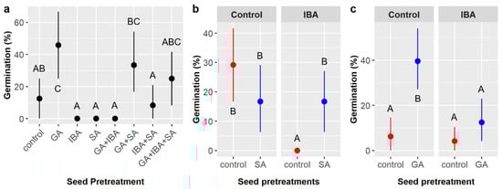Average germination likelihood of Cordia boissieri seeds with 95% confidence intervals broken down by (a) seed pretreatments, which included gibberellic acid (GA), indole-3-butyric acid (IBA), sulfuric acid (SA), and all combinations thereof; (b) IBA and SA treatments (red dots = SA not included, blue dots = SA included); and (c) GA and IBA treatments (red dots = GA not included, blue dots = GA included). Capital letters denote the results of least squares means post-hoc tests; groups within a panel that share a letter were not significantly different.
