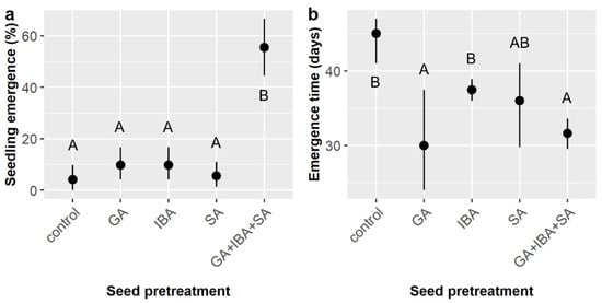 (a) Average likelihood of seedling emergence and (b) average time to emergence for Cordia boissieri seeds with 95% confidence intervals broken down by seed pretreatment, which included controls, gibberellic acid (GA), indole-3-butyric acid (IBA), sulfuric acid (SA), and GA + IBA + SA treatments. Capital letters denote the results of least squares means post-hoc tests; groups within a panel that share a letter were not significantly different.