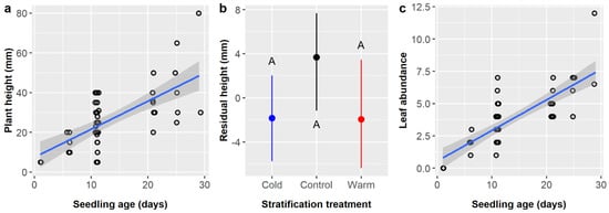 Scatterplots with trendlines showing the positive linear relationships between Cordia boissieri seedling age and (a) plant height and (c) leaf abundance; each dot represents one plant. (b) Average residual plant height with 95% confidence intervals broken down by stratification treatment (blue dot = cold, black dot = control, red dot = warm). Capital letters denote the results of least squares means post-hoc tests; groups within a panel that share a letter were not significantly different.