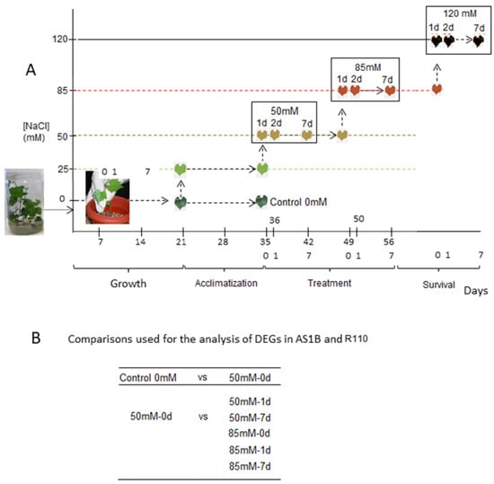 Experimental design and time course of the salt treatments on AS1B and R110 accessions. (A) Plants were irrigated with 200 mL of Hoagland’s solution every 2 days for 3 weeks, for the initial growth of the plants. Then, plants were treated with Hoagland solution with the addition of 25 mM NaCl for adaptation phase for 2 weeks, and after that the conditions were created with an increase of 50 mM to 120 mM NaCl. (B) Treatment conditions selected for differential expression analysis.
