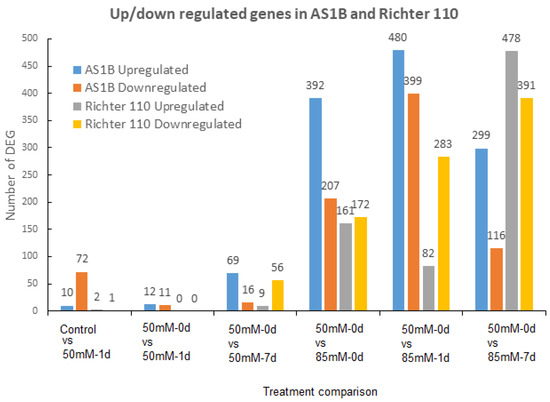 In the following three comparisons, the effect of the increase in salt concentration between 50 mM to 85 mM NaCl was analyzed. First, we compared the vines exposed to 50 mM NaCl for 1 h (50 mM-0 d) against those exposed to 85 mM NaCl for 1 h (85 mM-0 d); here, we observed a significant increase in the DEGs in both genotypes (Figure 2). The main difference between the genotypes is that AS1B presented more DEGs than R110; here, AS1B was counted with twice the number of upregulated genes compared to downregulated genes, while R110 displayed a similar number of upregulated and downregulated genes. These results suggest that AS1B produces a more intense and faster transcriptomic response than R110 to an increase in saline conditions. In the following comparison (50 mM-0 d vs. 85 mM-1 d), greater differences between the genotypes are observed. On the one hand, the DEG number has duplicated in AS1B compared to R110, and, in AS1B, there continues to be a greater number of upregulated than downregulated genes; while, in R110, there is a greater number of downregulated than upregulated genes. The results indicate again that AS1B has a higher number of genes that respond to a change in salinity than R110. In addition, R110 displays a higher number of downregulated than upregulated genes, suggesting a distinct adaptation to salinity, by decreasing the activity of the processes in which these genes could be involved (Figure 2). In the last analysis (50 mM-0 d vs. 85 mM-7 d), we studied the effects of salinity on the vines after 7 days of exposure to 85 mM of NaCl. This comparison shows again greater gene expression response in AS1B in contrast to R110; in addition, for the first time, we observe that in both genotypes there is a higher number of upregulated genes than downregulated genes. It is also noted that the number of DEGs in AS1B is lower than in the previous comparison (50 mM-0 d vs. 85 mM-1 d), suggesting an attenuation in the response of the plants to salinity. On the other hand, in R110, a large increase in the number of DEGs is observed compared to previous comparisons, suggesting that this genotype has a slower response, which we had already observed in previous periods.