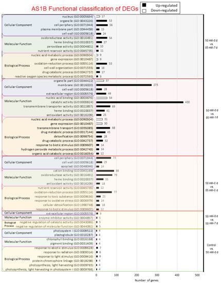 For the comparison of 50 mM-0 d vs. 85 mM-1 d, there is also a higher enrichment of GO elements in AS1B than in R110. Both genotypes share enrichment in detoxification and response to biotic stimulus (within the BP category); in MF, they share heme binding and antioxidant activity; and, in CC, they share organelle, cell wall, and extracellular regions. When it comes to the differences, we can highlight BP enrichment in AS1B in transmembrane transport and the drug metabolic process (for upregulated genes), in gene expression and the nucleic acid metabolic process (for downregulated genes), and in MF catalytic and transmembrane transporter activities. Meanwhile, R110 stands out in BP-oxidation-reduction and water transport processes and also in MF-ion-binding and oxidoreductase activities.