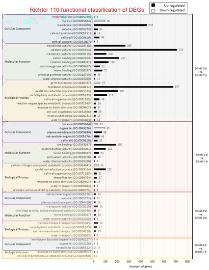 Panther output of GO results obtained in DEG analysis in Richter 110 under different comparisons: Control vs. 50 mM-0 d (green region), 50 mM-0 d vs. 50 mM-1 d (brown region), 50 mM-0 d vs. 50 mM-7 d (yellow region), 50 mM-0 d vs. 85 mM-0 d (red region), and 50 mM-0 d vs. 85 mM-7 d (gray region). Number of GO detected are expressed in upregulated (black bars) and downregulated (white bars) GO functions. For each comparison, 3 GO levels are shown: biological process (gray-outlined yellow box), molecular function (pink-outlined green box), and cellular component (violet-outlined gray box).