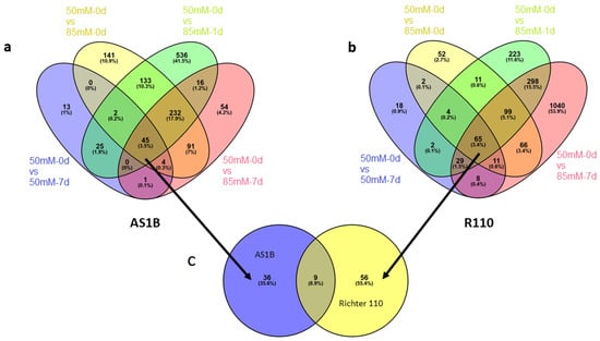 Venn diagram representation of DEGs under different salinity conditions (from 50 mM-0 d vs. 50 mM-7 d to 50 mM-0 d vs. 85 mM-7 d) for AS1B (a) and Richter 110 (b). Number of overlapped and non-overlapped areas that represent DEGs through the different conditions of salinity stress, with their equivalent percentages from the total amount of DEGs retrieved by consensus between NOISeq and DESeq2 pipelines. (c) Venn diagram representation of genes showing continuous differential expression across all conditions. Overall, 36 unique DEGs from AS1B, 56 DEGs from Richter 110, and 9 DEGs shared in common between genotypes (in total, 45 and 65, respectively, as seen in the core areas of (a,b)), with their equivalent percentages from the total combined amount of DEGs between genotypes.