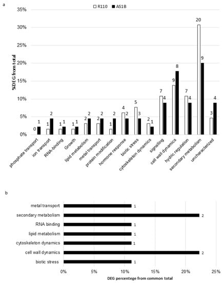 Functional distribution of AS1B and Richter 110 DEGs: DEGs by each accession (a); DEGs in common for both AS1B and Richter 110 (b). DEG percentages were calculated from the total amount of DEGs in each accession (45 DEGs for AS1B and 65 DEGs for Richter 110, with 9 DEGs among them). Numbers represented in the figure above and beside them represent the number of DEGs founded for each functional group.