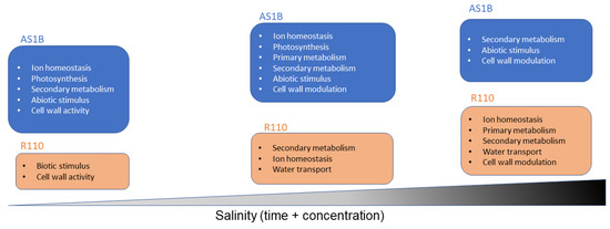In summary, our results suggest that the advantage of AS1B in surviving under severe salt stress could reside in its mechanisms of salt tolerance being activated at earlier stages of salinity, which also keep pace as this condition increases. This is reflected by the changes in AS1B’s gene expression observed at the first two instances when the concentration of salt treatment increased, while Richter 110 kept a constitutive expression. Furthermore, differences between both varieties were still noted across higher stages of salinity and different exposure times, where AS1B displayed a more specific response to salinity compared to Richter 110 (Figure 7).