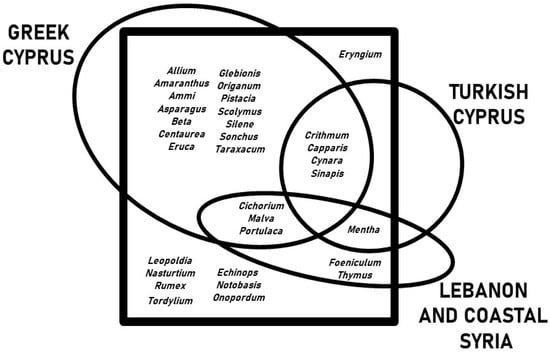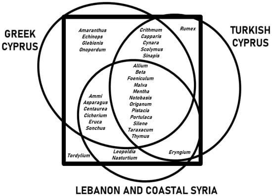 Figure 4 shows the overlap between the WVs gathered and consumed in Kurmajit, and those of their Greek and Turkish neighbors and communities in Lebanon and Syria. The highest number of overlaps (twenty-eight out of thirty-two genera) are with the records from Greek Cyprus, four of them exclusively (Amaranthus, Echinops, Glebionis, Onopordum). Of the eighteen genera shared with Turkish Cyprus, only one taxon (Rumex) was shared exclusively, while twenty-one taxa were also used in Lebanon and coastal Syria. The only taxon found exclusively in the Maronite community was Tordylium, which was used as a seasoning.