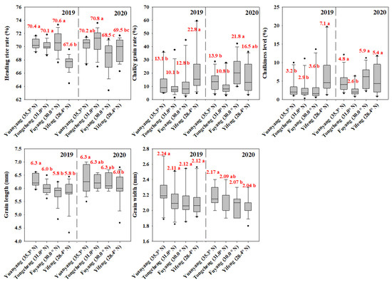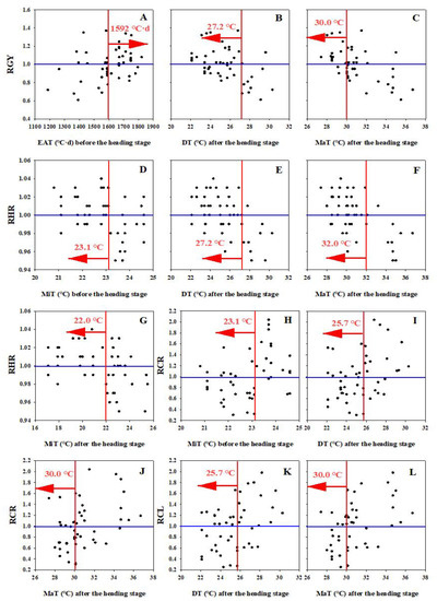 - Cheng, C.; Ali, A.; Shi, Q.H.; Zeng, Y.H.; Tan, X.M.; Shang, Q.Y.; Huang, S.; Xie, X.B.; Zeng, Y.J. Response of chalkiness in high-quality rice (Oryza sativa L.) to temperature across different ecological regions. J. Cereal Sci. 2019, 87, 39–45. [Google Scholar] [CrossRef]