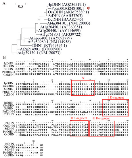 (A) Phylogenetic relationships between the PtrDHN-3 (Potri.005G248100.1) protein and dehydrins (DHNs) from other plant species. The molecular phylogeny was constructed from complete protein sequence alignment using the neighbor-joining method with ClustalW. The scale bar indicates the average number of amino acid substitutions per site. “*” Indicates the position of PtrDHN-3 in the phylogenetic tree. (B) Sequence analysis of the PtrDHN-3 protein. Multiple sequence alignment of the PtrDHN-3 protein with IpDHN (Ipomoea pes-caprae L. AQZ36519.1), OesDHN (Olea europaea L. subsp. europaea, var. Sylvestris, AKM95889.1), StDHN (Solanum tuberosum L. AAB53203), CcDHN (Coffea canephora Pierre ex Forehn. ABC68275) and DcDHN (Daucus carota L. BAA82445). Red squares indicate conserved amino acid sequences of S-and K-segment motifs. K segments include ⅠK segment: EKKGIMDIKEKLPG and ⅡK segment: (Q/E)K(P/A)G(M/L)LDKIK(A/Q)(K/M)(I/L)PG motif.